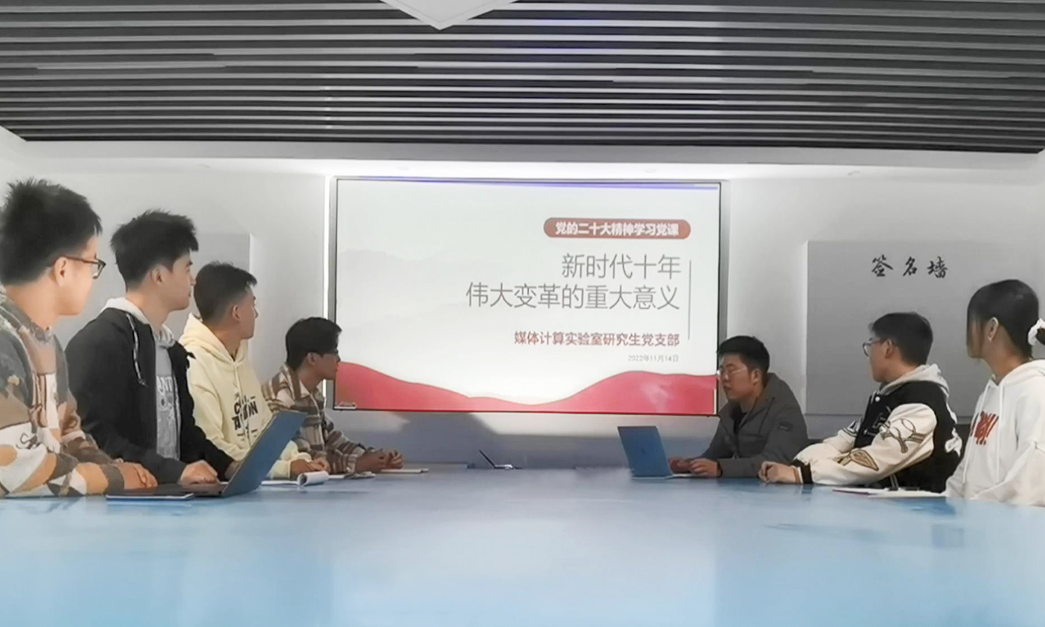11月14日,金沙2004路线js5媒体计算实验室研究生党支部在科教楼A座9楼中厅开展了“新时代十年的伟大变革”主题党日活动,活动围绕“新时代十年伟大变革的里程碑意义”,深入探讨习近平新时代中国特色社会主义思想,回顾党的光辉历史和十年来我国经济社会的发展变化。支部全体党员参加学习。