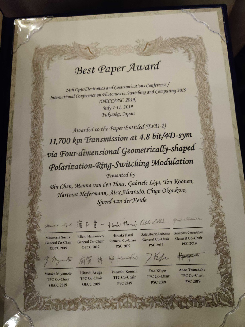 近日,第24届国际光电子和通信会议(OECC2019)在日本召开。金沙官网陈斌老师的论文“11,700 km Transmission at 4.8bit/4D-sym via Four-dimensional Geometrically-shaped Polarization-Ring-Switching Modulation”获得了本次会议的最高奖项——最佳论文奖(Best Paper Award)。OECC会议是光通信领域最重要、最具影响的国际学术会议之一。